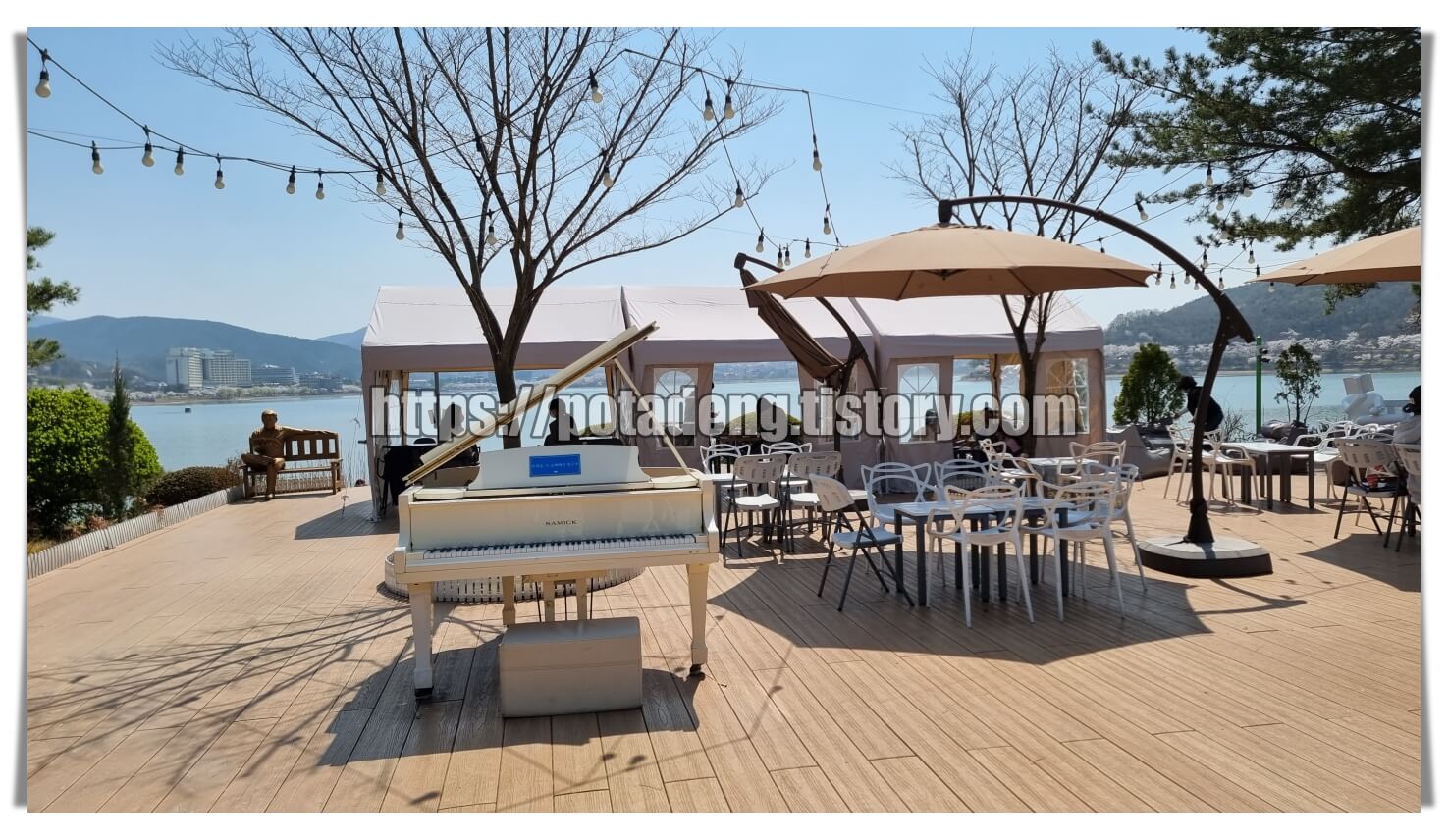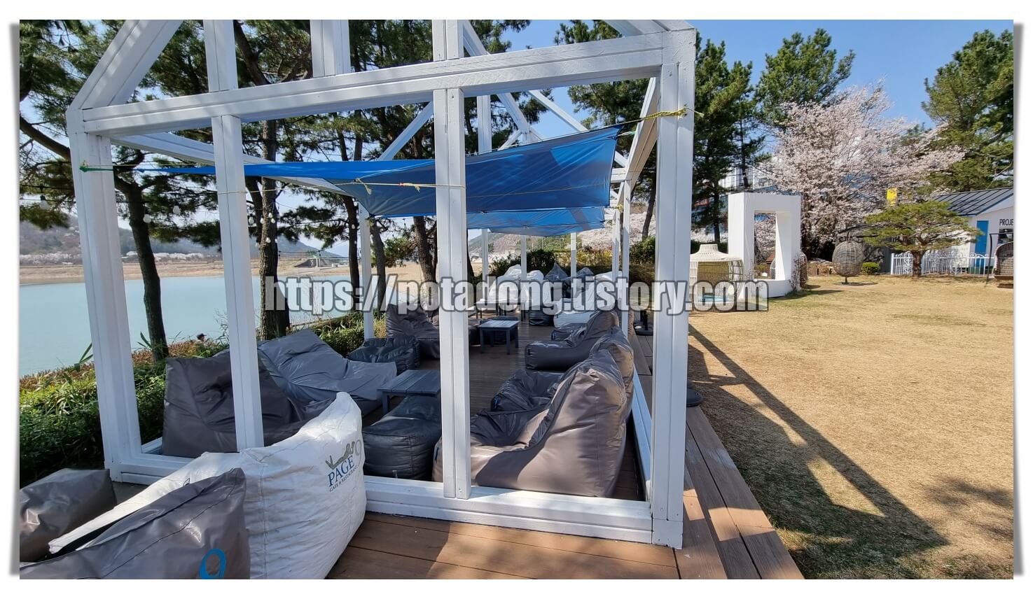 ▶ 야외에는 파라솔 테이블과, 천막이 쳐져있는 그늘 테이블도 있었습니다. 저희는 야외 빈백이 더 편해 보여 야외 빈백에서 호수를 바라보았는데 저 안이 메인 자리인 것 같았습니다. 피아노는 있었는지 저도 포스팅을 하면서 알게 됐네요.