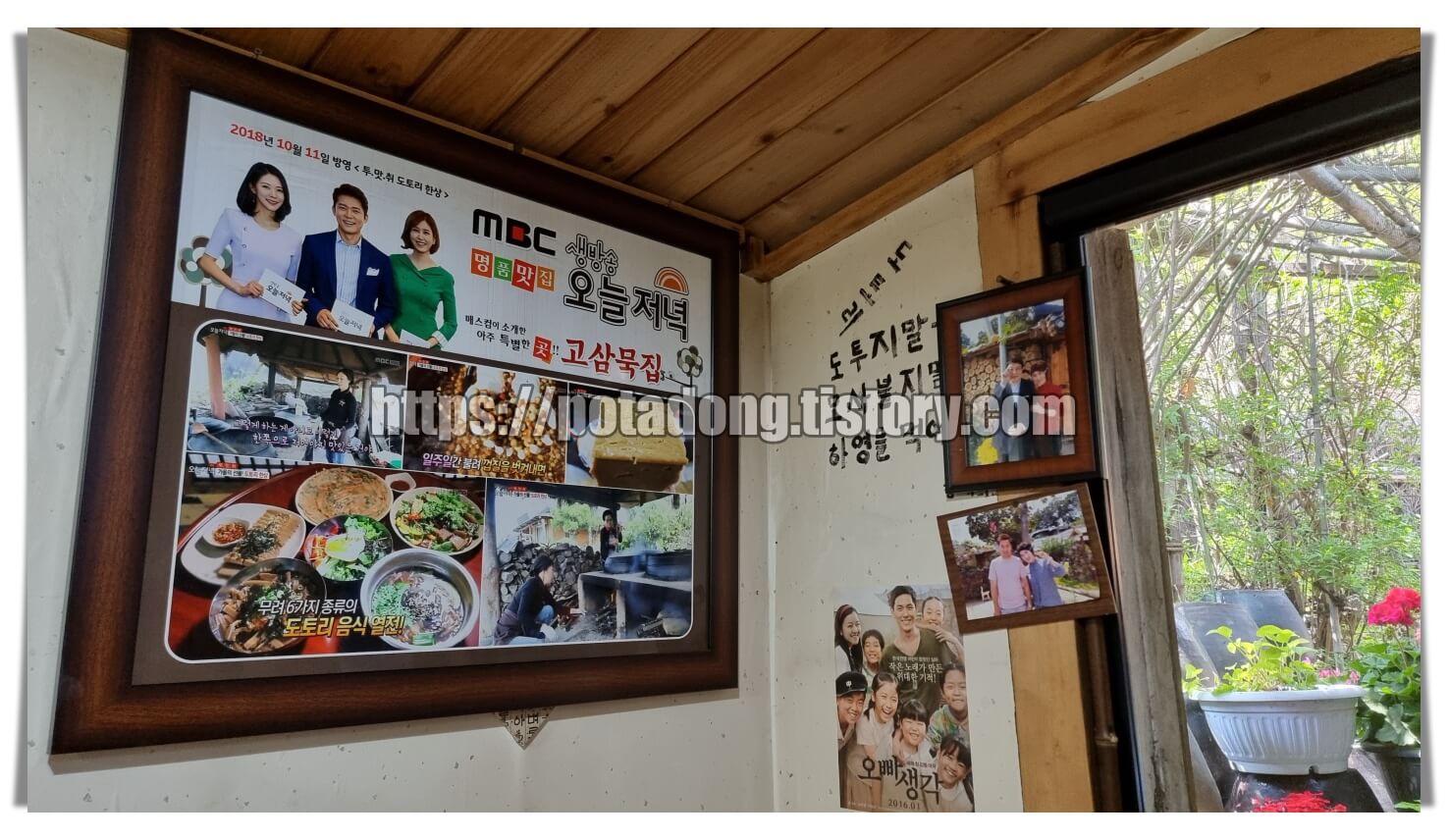 ▶ 실내로 들어가자 마자 보이는 가마솥에 끓이고 있는 냄비에 묵이 가득했습니다. 묵이 들어 있는 모습은 급하게 들어가느라 아쉽게도 찍지 못했습니다. 벽엔 수많은 연예인들과 사인들이 즐비하였는데 간접적으로 맛집이긴 하구나 하는 느낌을 주었습니다.