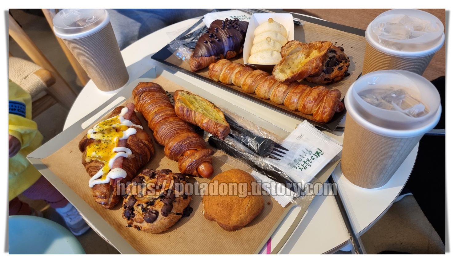 ▶ 주문한 베이커리와 음료들입니다. 자제한 것에 비하면 많은 양인 것 같지만 성인4명과 아이2명이 함께 먹는 양입니다. 전 아이스아메리카노를 주문했지만 아이스라떼로 잘 못 나왔습니다. 라떼도 나쁘지 않아 그냥 먹었습니다.