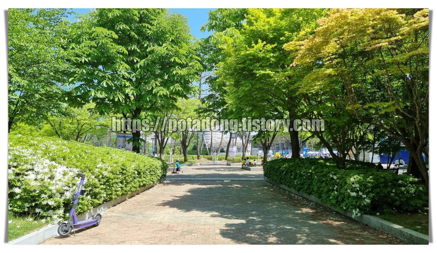 ▶ 주차장에서 진입하자마자 푸른 나무들이 가득하여 공원의 운치를 보여 주었습니다. 경기 시작하기 꽤 이른 시간이었지만 어린이날인 만큼 아이들과 함께 나들이를 나온 가족들이 많이 보였습니다.