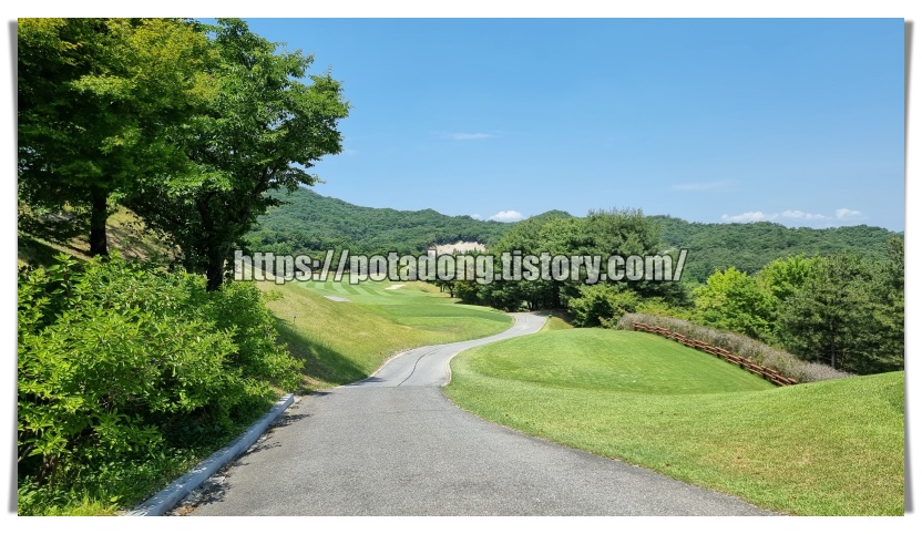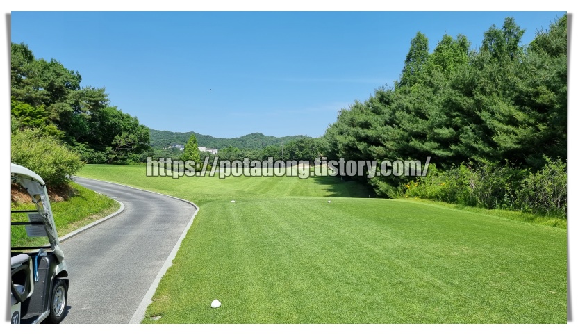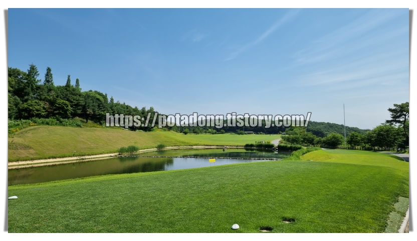 ▶ 코스는 가람코스부터 시작하였습니다. 1홀부터 9홀까지 홈페이지 코스 안내와 실제 제가 찍은 모습입니다. 각 홀마다 이름들이 붙어 있었는데 홀 이름과 실제 뜻이 같이 표시되어 있었습니다. 라운드마다 티샷에서 홀컵까지의 거리와 코스가 친절하게 나무 팻말로 안내되어 있는데 코스를 확인하는데 매우 도움이 되었습니다. 사진은 1홀에서 못 찍은 관계로... 2홀 사진으로 대체합니다. ㅎ