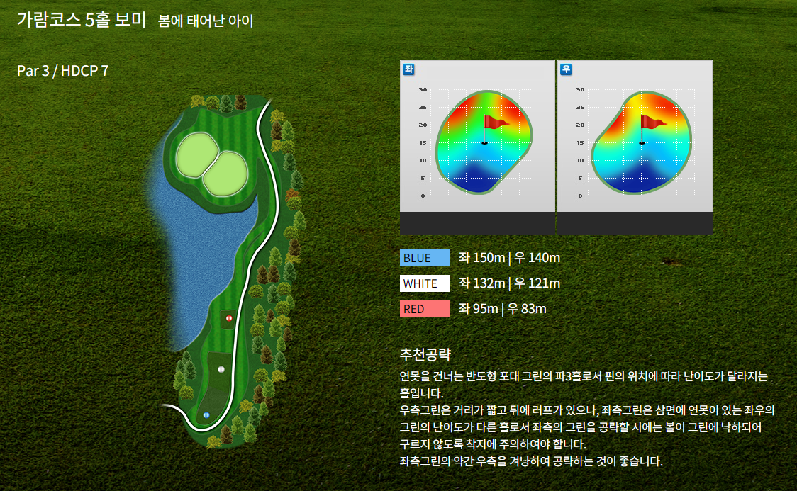 ▶ 가람코스의 5홀 보미의 코스 소개입니다. 파3홀 핸디캡 7번홀입니다. 연못의 크기가 매우커 짧은 채보다는 긴채로 치는게 무난해 보입니다. 우그린보다 좌그린이 매우 까다로워 보입니다.