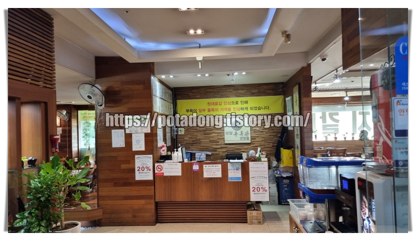 ▶ 입구에 들어서면 보이는 모습입니다. 가운데 원재료값 인상으로 가격이 인상되었다는 문구가 가장 눈의 띄네요. 이전에 방문했을 당시 매우 맛있게 먹었던 기억이 있어 다시 방문하였는데 겉모습은 별 차이가 없었던 것 같습니다.