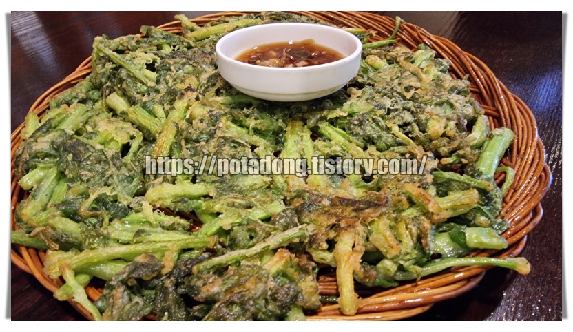 ▶ 미나리전입니다. 생각보다 리얼 미나리전이었습니다. 미나리를 전으로 하였는데 생각보다 밀가루는 별로 없었으며 잘 익어서 미나리의 식감 매우 독특하였습니다. 하지만 2인 분임에도 매우 많은 밑반찬과 음식들이 있어 반 정도 남긴 것 같습니다.