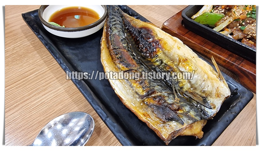 ▶ 생선 구이입니다. 저희는 1인을 시켜 고등어 구이가 나왔는데 2인 생선은 메뉴판을 보니 가자미, 고등어 2마리가 나온다고 나와 있었습니다. 생선이 맛있고 아이가 좋아하여 매우 만족했습니다.