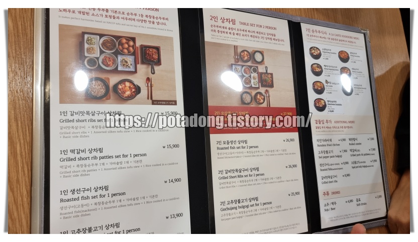 ▶ 메뉴판입니다. 왼쪽에 1인 상차림 세트메뉴가 있고 가운데 2인 상차림 세트메뉴 맨 오른쪽엔 단품 메뉴들이 있습니다.