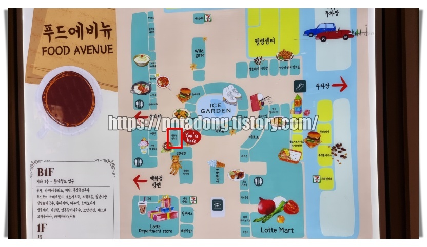 ▶ 북창동 순두부는 아래 롯데월드 건물의 푸드 에비뉴 안에 있습니다. 아래 빨간색으로 표시한 부분이 북창동 순두부이니 참고하셔서 찾아가시면 될 것 같습니다.