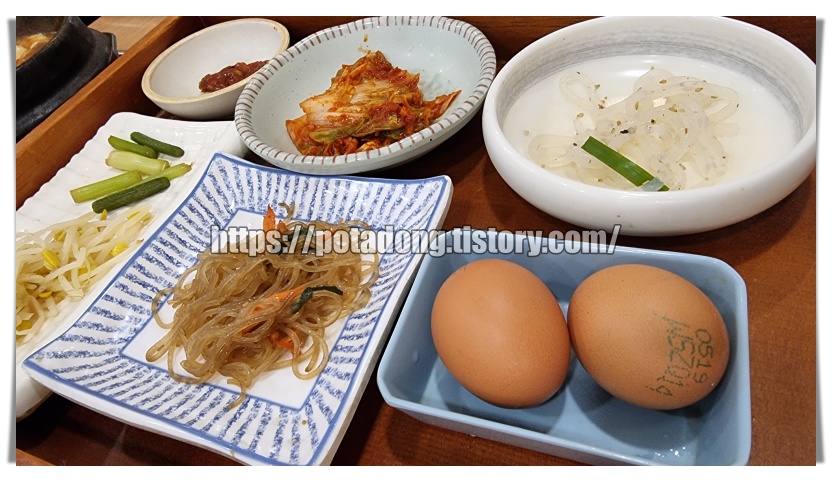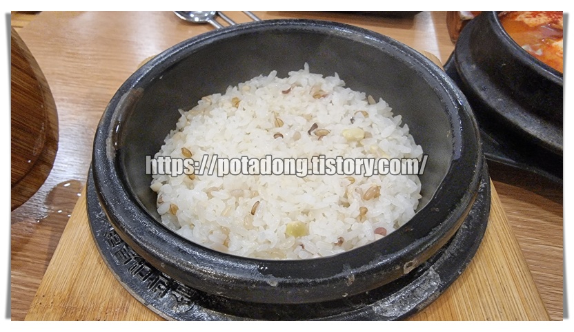 아이와 함께 방문하여 1인 세트 2개에 공깃밥 하나를 추가하여 아이와 함께 먹었는데 미리 말씀드리면 양은 충분했던 것 같습니다. 상차림 메뉴는 단품 메뉴(생선구이, 떡갈비, 고추장 불고기 등) + 순두부찌개 + 가마솥밥 + 기본 반찬 등이 구성입니다. 모두 북창동 순두부라고 표시되어 똑같은 순두부를 2개 주시나 했더니 추가금을 내면 다른 순두부찌개로도 변경 가능하다고 하여 곱창 순두부로 변경 주문하였습니다.