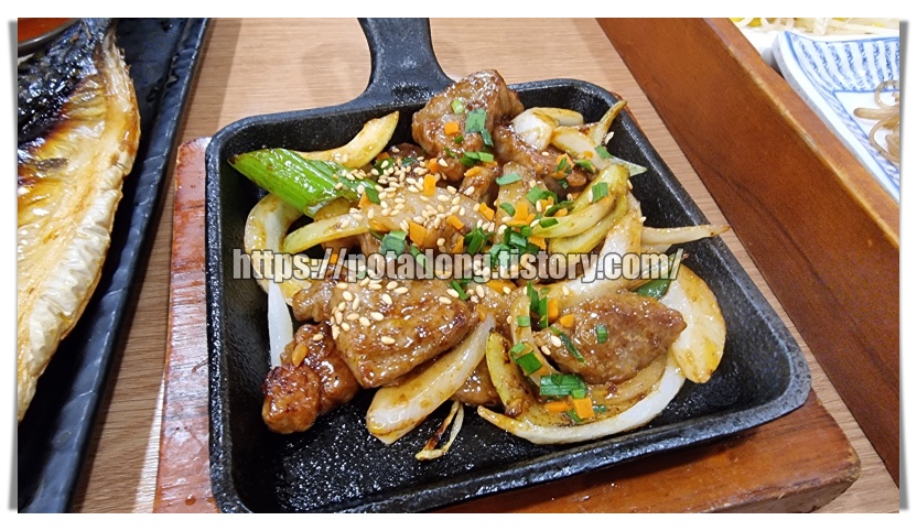 ▶ 갈비맛 목살구이입니다. 아이가 먹을 수 있을 것 같아 시켰는데 아이가 안 먹는다 하더군요. 맛이 있고 맵지도 않았는데 의사를 존중하여 저의 주 반찬으로 타게팅하였습니다.