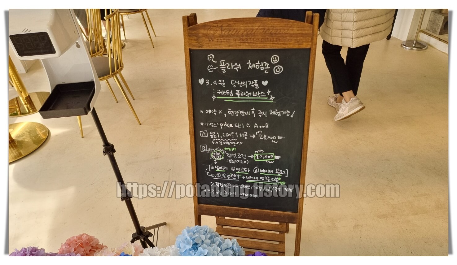▶ 안쪽에 전시되어 있는 꽃다발이 있었는데 구매 시 아메리카노 1잔 무료 이벤트 안내도 하나 봅니다. 연인끼리 와서 이벤트로 꽃다발 하나 주면 로맨틱할 것 같습니다.